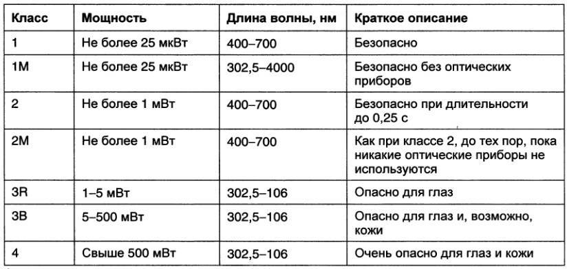 В лазерном пучке концентрируется высокая энергия и потому существует опасность повредить зрение при неосторожном обращении с лазерами. Существует классификация опасности лазерных установок в соответствии с EN60825-1 рисунок №1