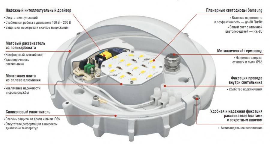 Осветительный прибор такого типа, как и светильник любой другой конструкции, имеет в своем составе: