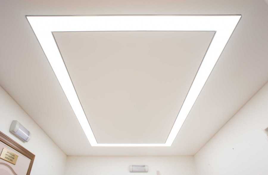 Технология монтажа встраиваемых линейных светодиодных и люминесцентных светильников не имеет принципиальных отличий. Если необходимо сделать подсветку в потолке из гипсокартона, конструкция каркаса должна предусматривать углубление шириной от 5 см (зависит от высоты корпуса встраиваемого прибора). Потолок с линейной подсветкой, расположенной в такой нише, называют «парящим».