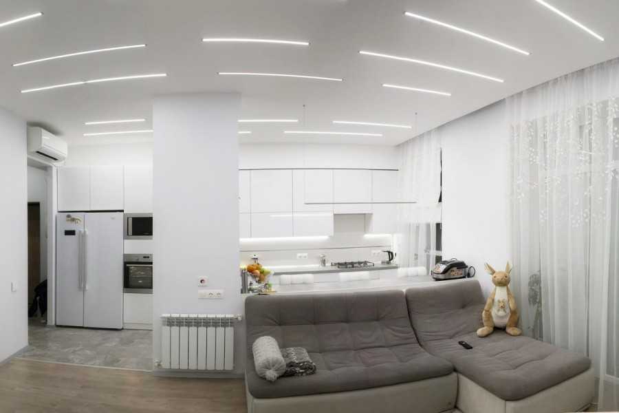 - Бестеневое освещение. Любой точечный световой прибор, в том числе и люстры, создают световые пятна. Линейные модели равномерно освещают помещение, не оставляя теней.