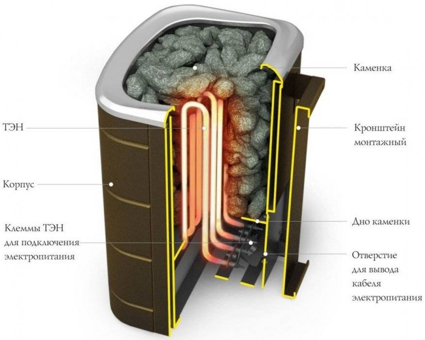 Электропечь для сауны имеет достаточно высокий КПД – свыше 85%, и быстро прогревает помещение (в зависимости от площади понадобиться 15-30 мин.). Схема устройства приведена на фото далее.