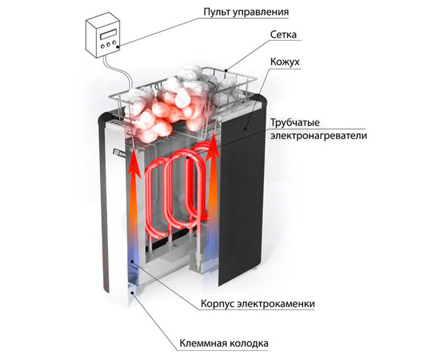 Нагрев происходит конвекционным способом — верхняя часть корпуса электропечи обычно открытая. Горячий воздух поднимается вверх и греет камни. Кроме этого, он проходит сквозь промежутки между ними и нагревает помещение.