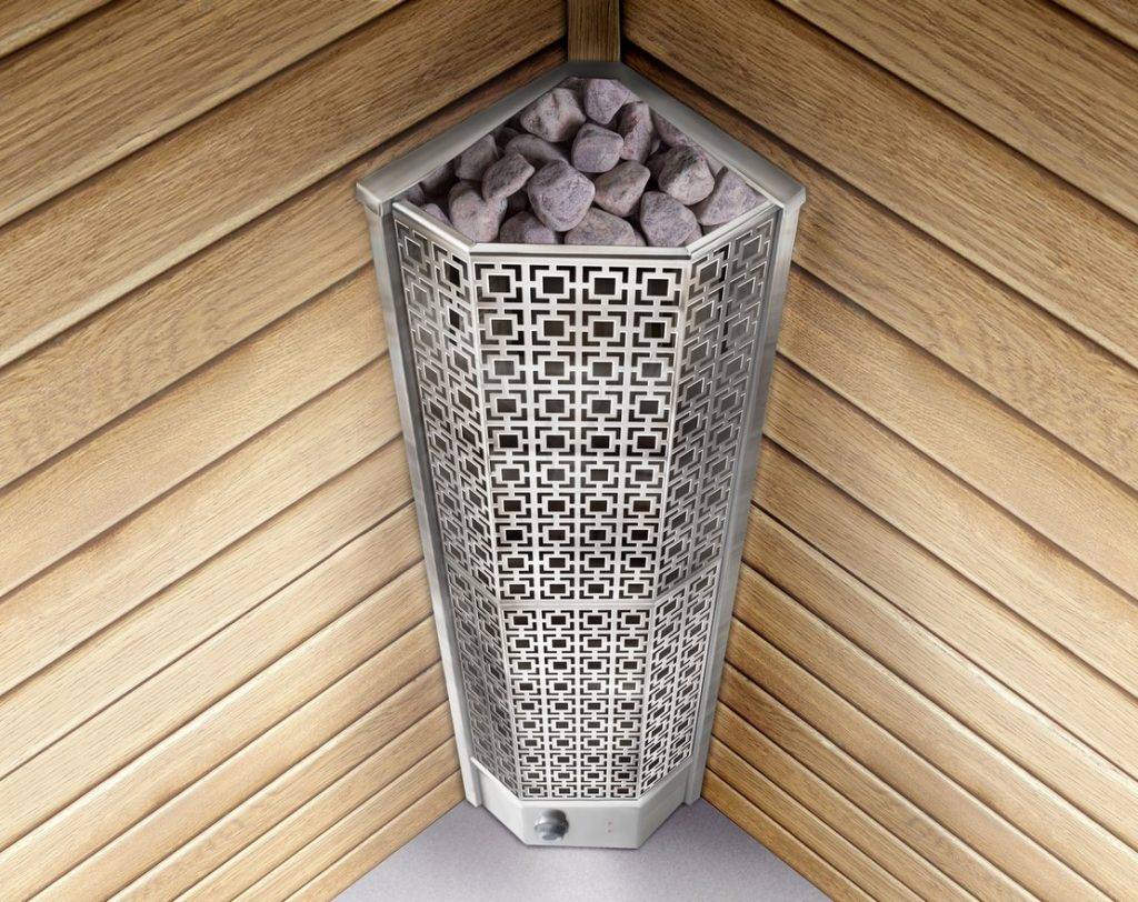 Угловая каменка займет немного места в парной, ее можно использовать для русской парной и сауны. В металлический кожух входит до 80 кг камней, которые равномерно распределены по высоте 1,3 м и вокруг ТЭНа. Нагревательные элементы и внешний корпус выполнены из нержавейки.