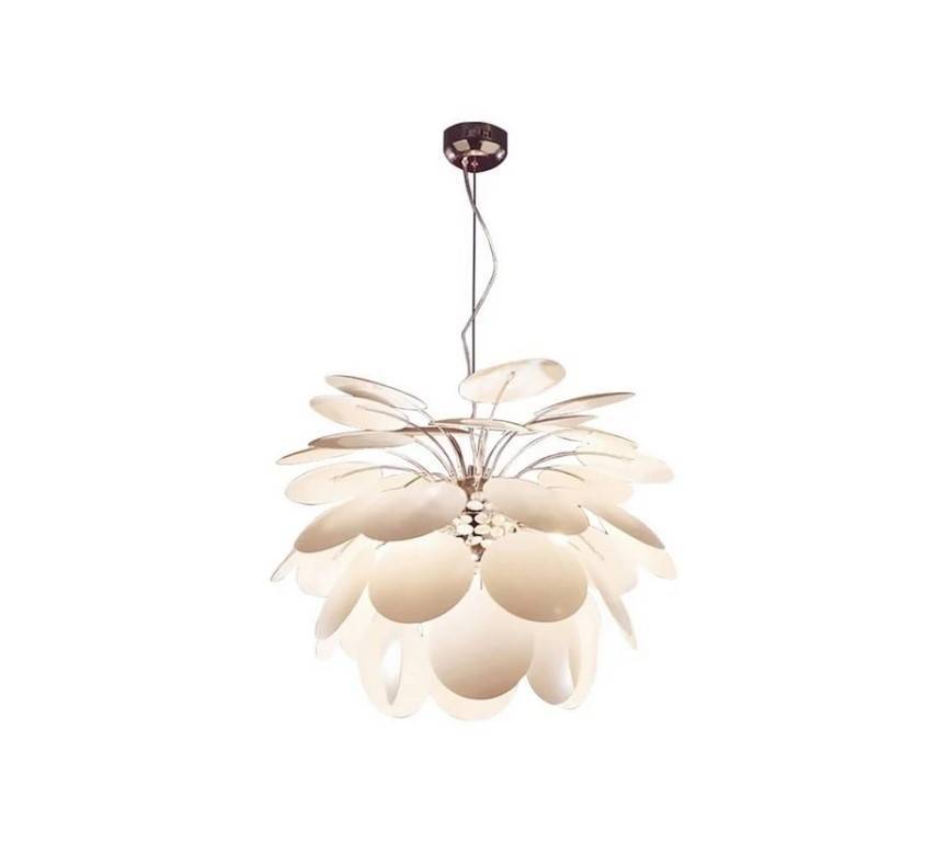 Эта люстра из Италии — настоящее произведение искусства. Только посмотрите на этот нежный «цветок», спускающийся с потолка! Модель за счет массы стеклянных лепестков действительно напоминает по своей форме цветок клевера и идеально дополнит образ спальни с растительными мотивами. Люстра рассчитана на использование 6 лампочек, может быть выполнена как в белом, так и в бежевом цвете. Тип цоколя — E27. Однако модель дорогая, и это ее главный минус. Стоимость такой люстры — около 16 тысяч рублей. Да и содержать ее в чистоте сложно. Но она точно украсит спальню семейной пары, не утратившей романтичности чувств.