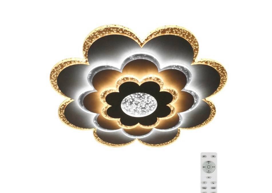 Универсальная люстра, которая подойдет практически для любого помещения. Ее уникальная форма цветка позволит ей органично вписаться как в детскую комнату с подходящим интерьером, так и во взрослую спальню, гостиную и даже в кухню. Люстра светодиодная, оснащена специальным пультом, позволяющим менять цвет освещения от теплого желтого до холодного белого. В выключенном состоянии — белая и отлично смотрится на любом потолке. Не раздражает глаза, не пульсирует во время работы, но при этом достаточно яркая. Установить ее можно на любой тип потолка в комнате площадью до 27 квадратов. Мы рекомендуем использовать ее в спальне или гостиной.