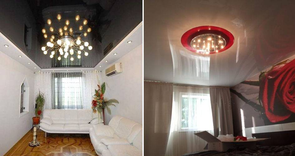 - При совмещении глянцевого полотнища со светильником оригинальной и причудливой формы создается уникальный отражающий эффект.