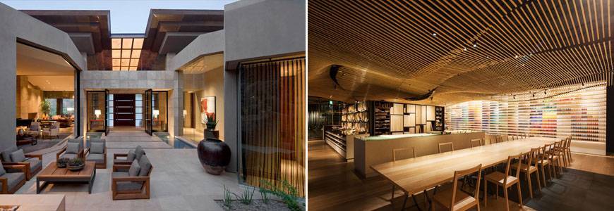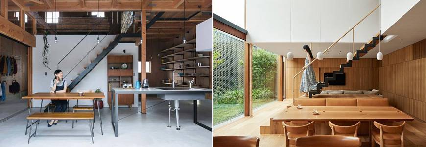 Наиболее родственным этому стилю является современный минимализм. Хотя в традиционном японском доме нет четко обозначенных комнат, но вся площадь имеет выраженное зонирование. Его делают с помощью разноуровневых полов и потолков, бамбуковых и бумажных ширм и перегородок, рассеянного и акцентированного освещения.
