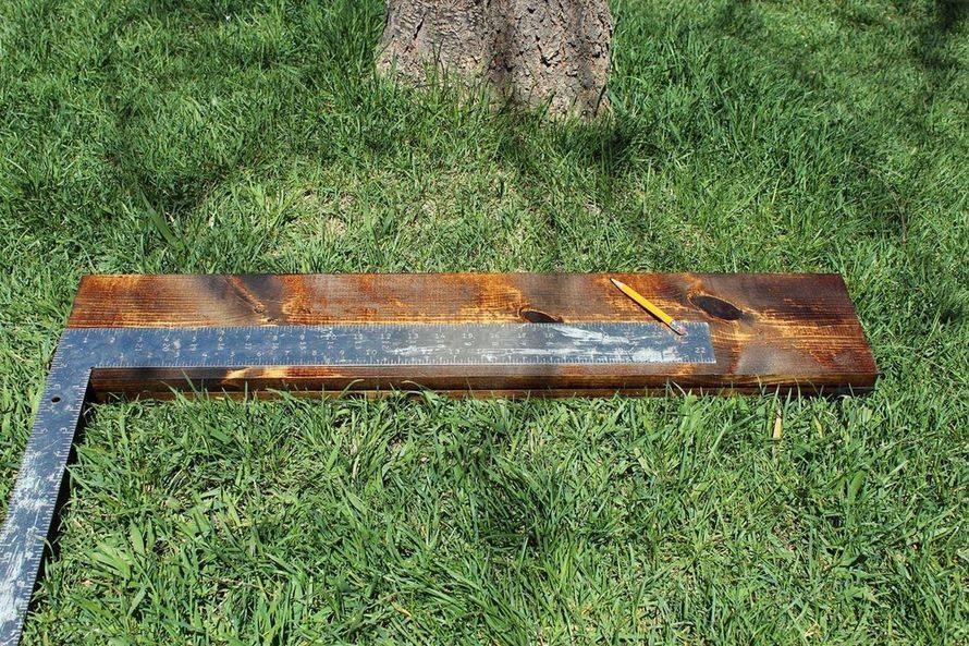 | Отмерить и распилить 4 бруса, которые будут закреплены между верхним и нижним каркасом под наклоном. | |