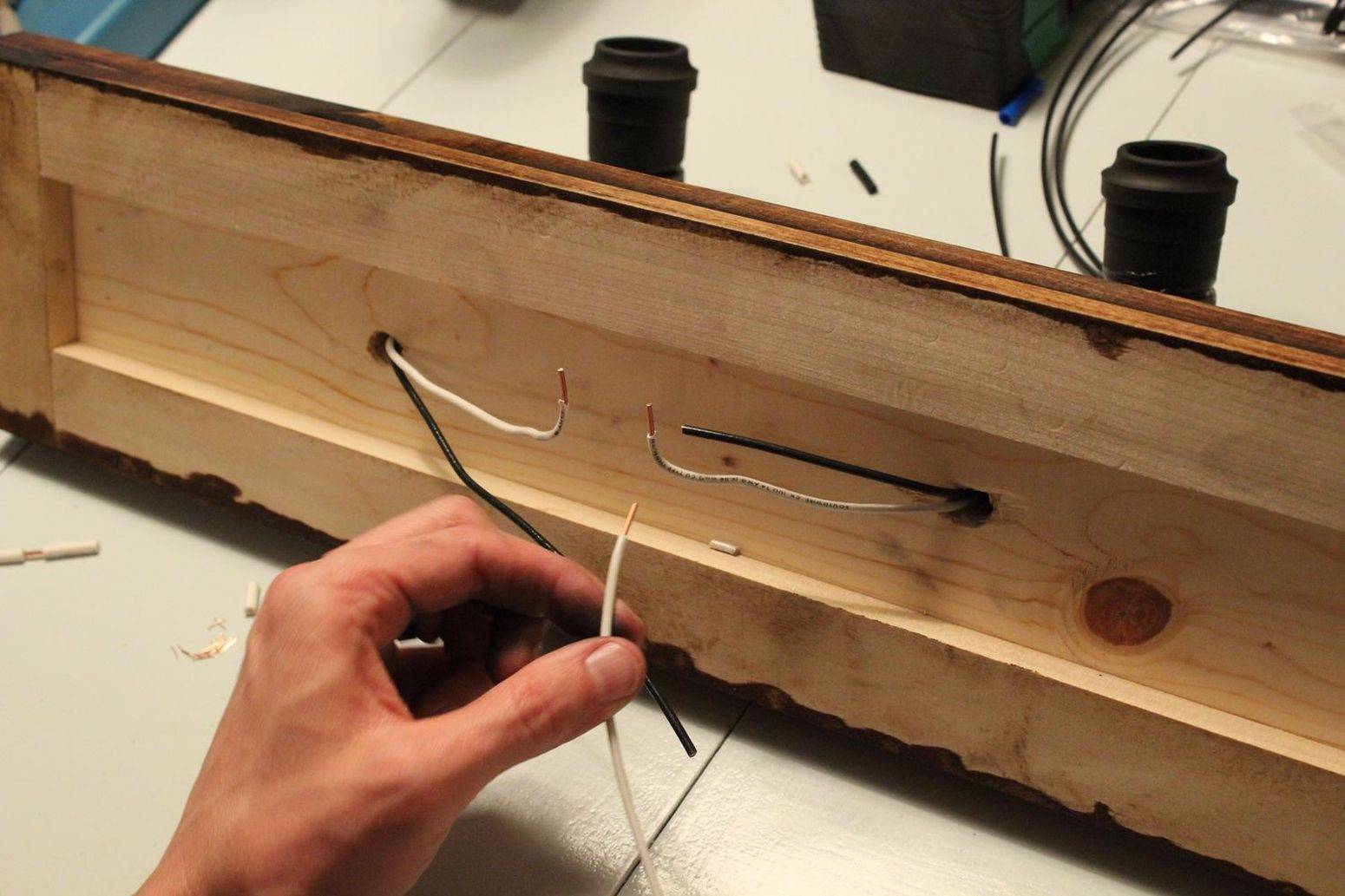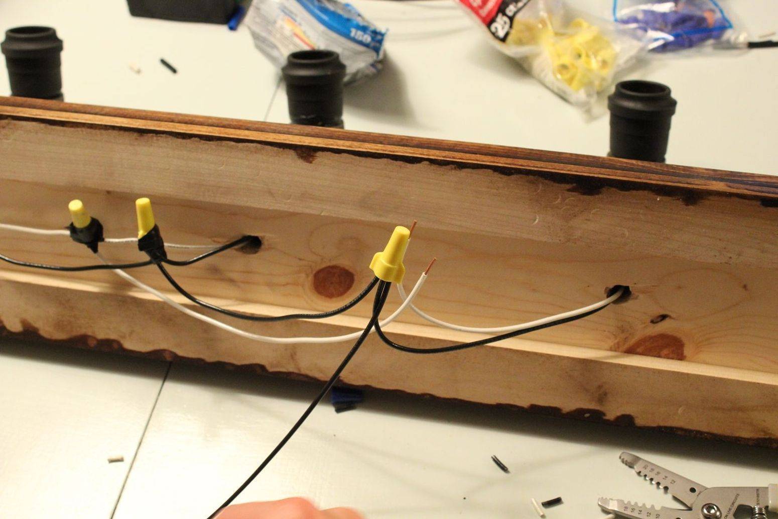 | В верхней части конструкции сделать 3 небольших отверстия, продеть в них провода, изнутри закрепить патроны, а сверху посадить на саморезы. Затем соединить 3 провода в общий. | |