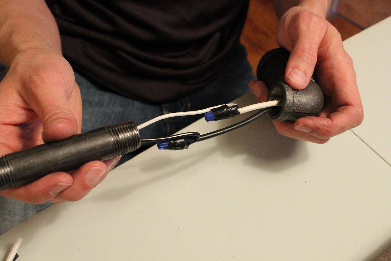| Соединить уголок с прямым отрезком трубы, предварительно намотав за резьбу ФУМ-ленту, протянуть через них 2 провода. | |