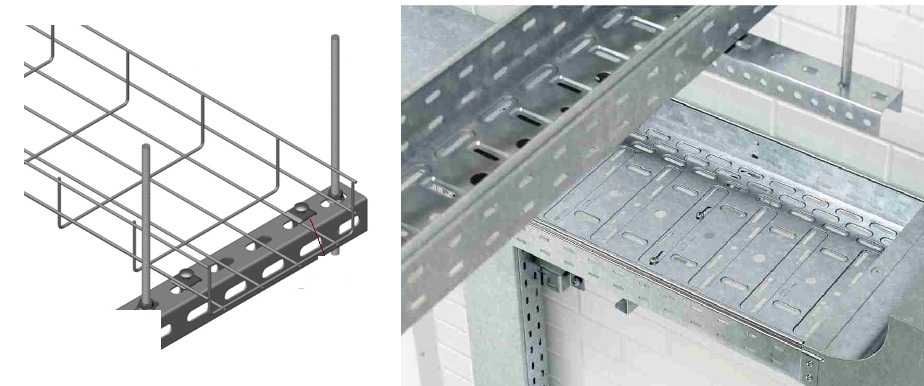 Такое крепление кабеля также требует установки подвесов, но количество крепежа намного меньше. Еще один плюс такого способа прокладки кабелей — легко при необходимости заменить или проложить новые. Минус — лотки не очень дешевы.