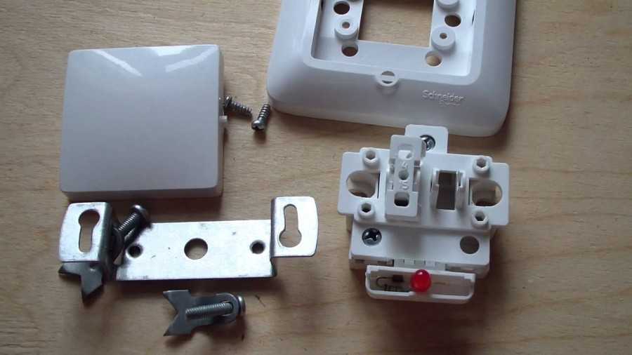 Вначале нужно снять накладные элементы клавиш, открутить пластмассовую рамку под ними и наружную обшивку устройства. Таким образом, вы доберётесь до главных рабочих элементов устройства на керамической основе. В этом узле будут видны с одной стороны от механизма для клавиш одна клемма, а с противоположной стороны от него их будет две – для проводов к отдельным двум светильникам (либо к двум лампам одного светильника).