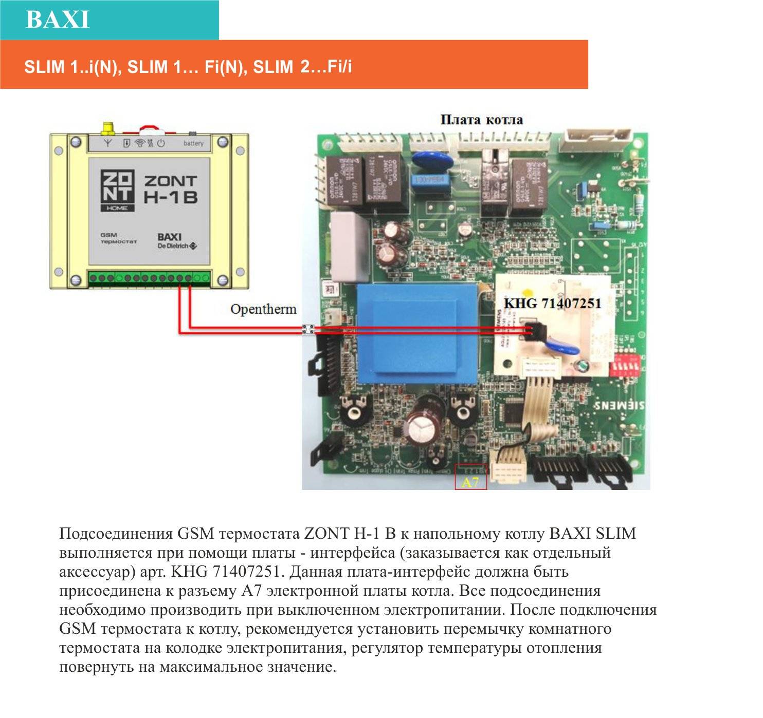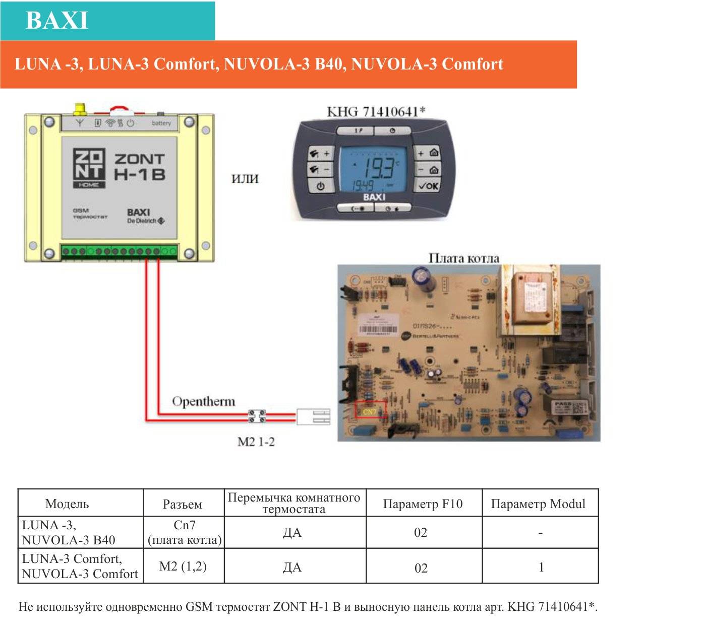 Схемы подключения термостата ZONT H-1B к котлам BAXI в режиме OpenTherm