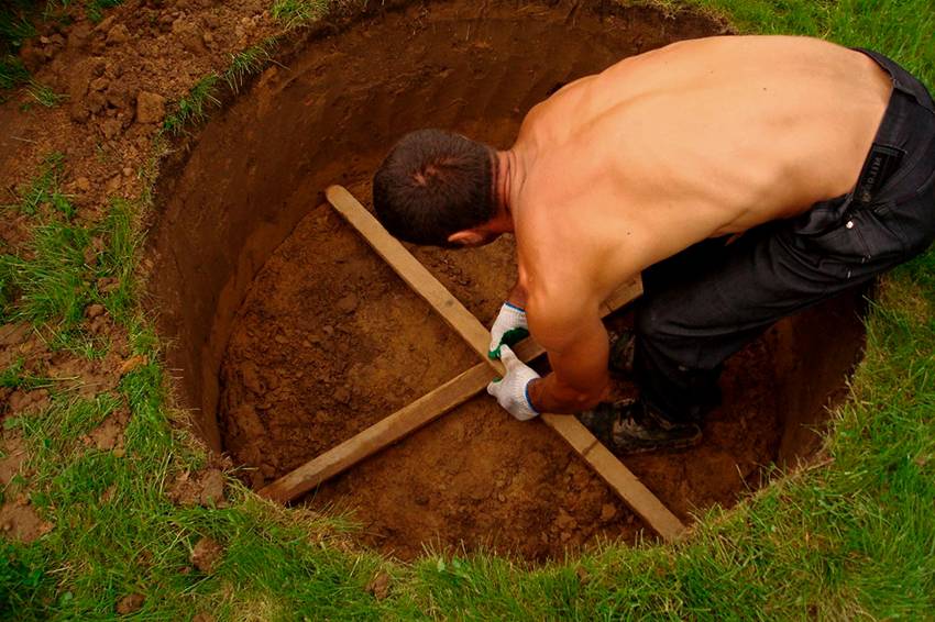После определения места колодца можно приступать к рытью шахты. Для этого, сначала выкапывается яма диаметром с кольцо, на глубину высоты колодца. Затем в нее опускается кольцо, и методом подкопа от центра к краям роется шахта дальше.Таким образом, под собственным весом Ваше кольцо будет проваливаться все ниже, и ниже, пока не достигнете нужной Вам глубины.