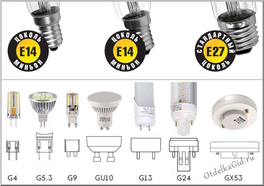 В линейке всех видов ламп есть модели со стандартными винтовыми цоколями диаметром 14 мм и 27 мм, в то время как штыревые цоколи с маркировкой «G» идут только на светодиодные модели