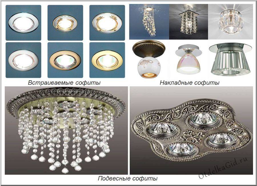 Накладные и подвесные софиты между собой отличаются только размерами, при этом подвесной вариант не пользуется популярностью, так как проще повесить полноценную люстру