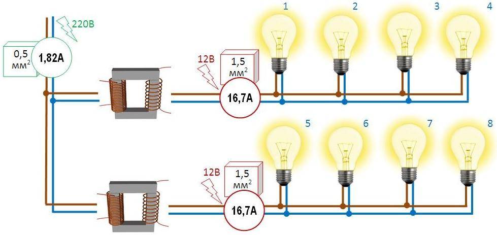 Для сравнения галогеновая лампа 220 В, мощностью 50 Вт питается током в 0.25 (Четверть) Ампера, 12 В 50 Вт чуть больше 4 Ампер. Разница почти в 20 раз. А если точечных светильников с такими лампами будет около 10?