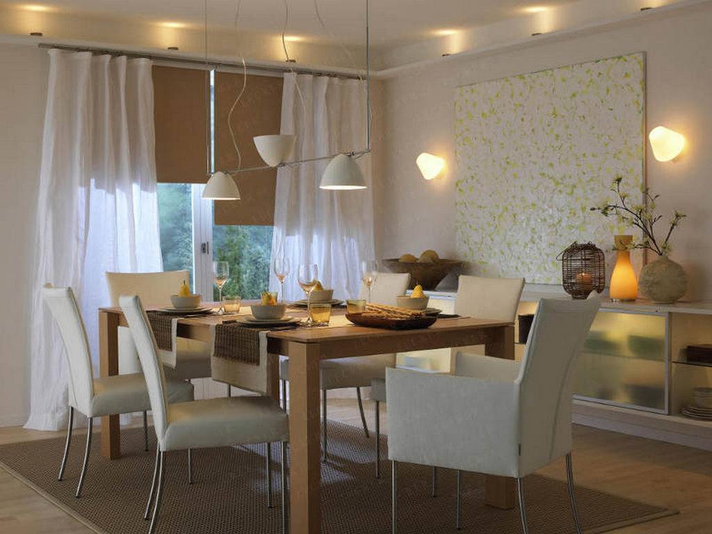 Например, если вы хотите выделить столовую зону как отдельную секцию помещения, можно повесить два бра по ее краям, а в центре — небольшую люстру или потолочный светильник. Таким образом обеденный стол будет визуально отграничен от остальной кухни световыми потоками.