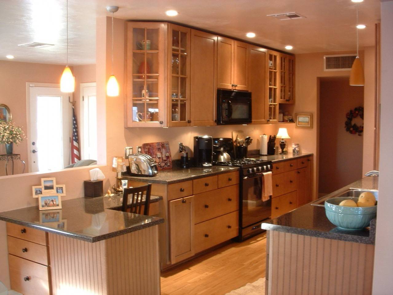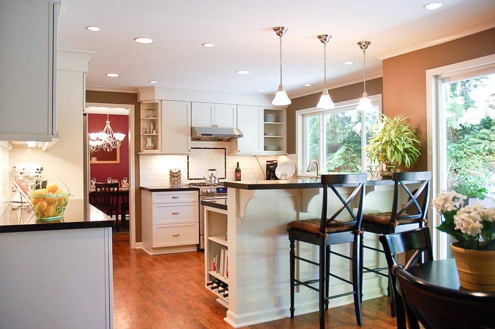 Какого бы размера ни была кухня, ее стараются зонировать хотя бы на два участка — столовую и кухонное пространство. Освещение — отличный способ зонирования. Рядом с обеденным столом размещают две настенные лампы, а над зоной приготовления пищи устанавливают точечные светильники.
