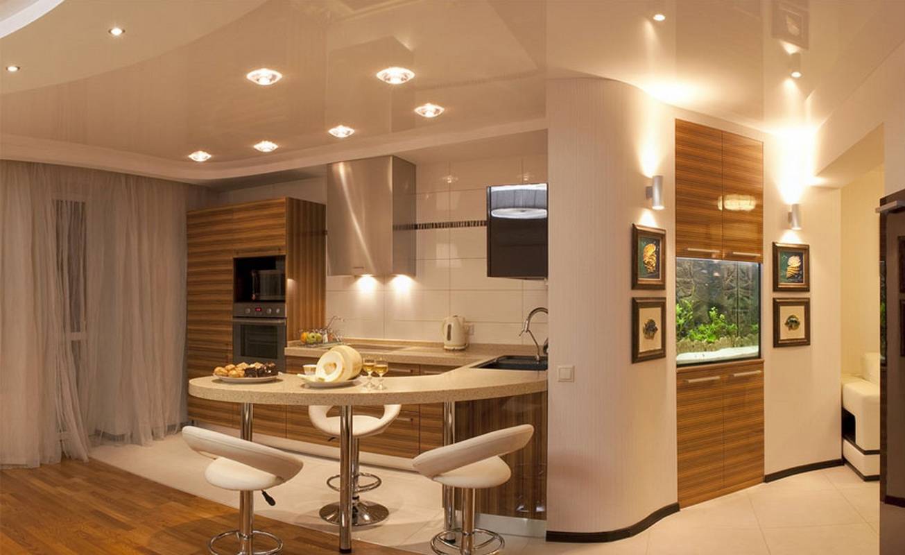 Кроме того, вы можете установить бра в тех местах, которые хотите визуально выделить освещением — над барной стойкой, кухонным уголком, диваном. Такой световой акцент подчеркнет выбранный элемент интерьера, но не затмит остальные составляющие кухни.