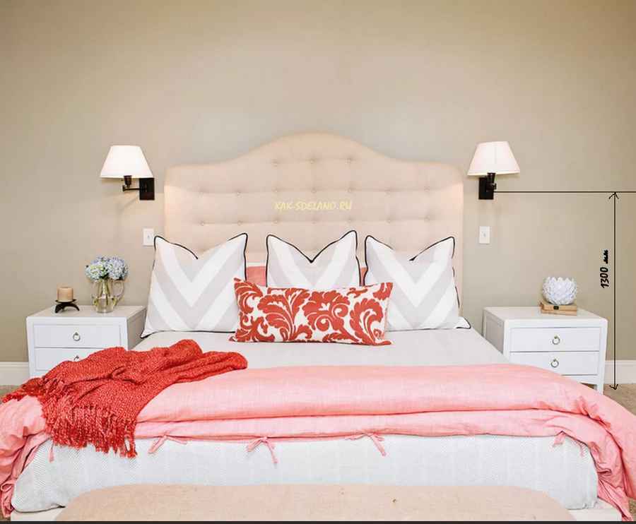- Высота спинки кровати. Светильник должен располагаться в 20-30 см над спинкой. Однако здесь речь идет о стандартном изголовье. Иногда эта деталь настолько высока, что лампу не получается установить даже на 160-сантиметровой высоте. Поступить следует так: подвесить светильник чуть выше края спинки, оснастив его шнурком. Можно не вешать лампу выше кровати, а вмонтировать ее прямо в спинку.