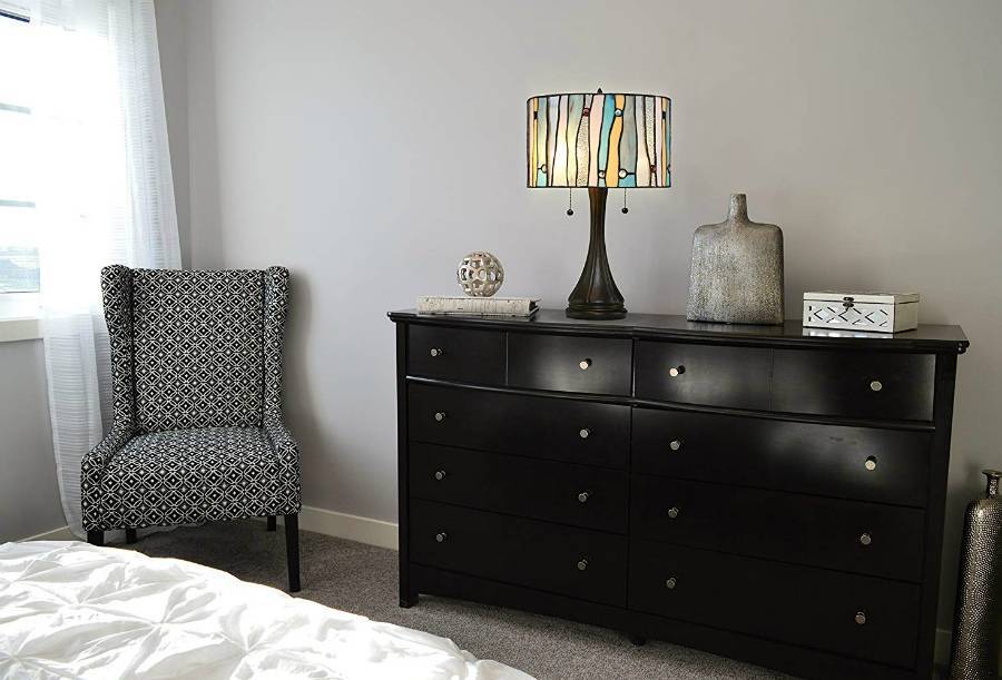 В спальне хорошо дополняют друг друга потолочная люстра или торшер в стиле Тиффани. При желании торшер легко можно переставить в другое помещение. Прекрасно вписывается в интерьер и настольная лампа. При ее мягком, приглушенном свете, проходящем сквозь «стекла Тиффани», хорошо читать. Кроме того, такой свет создает умиротворение и покой — необходимые свойства спальни.