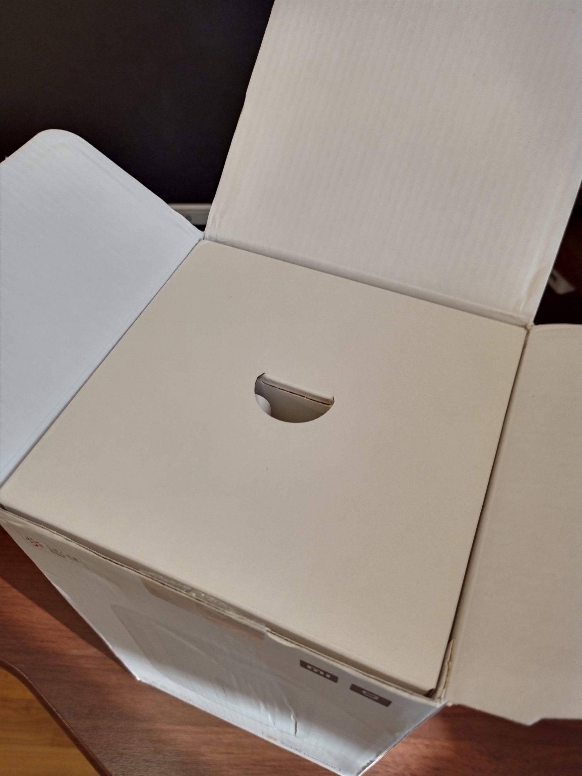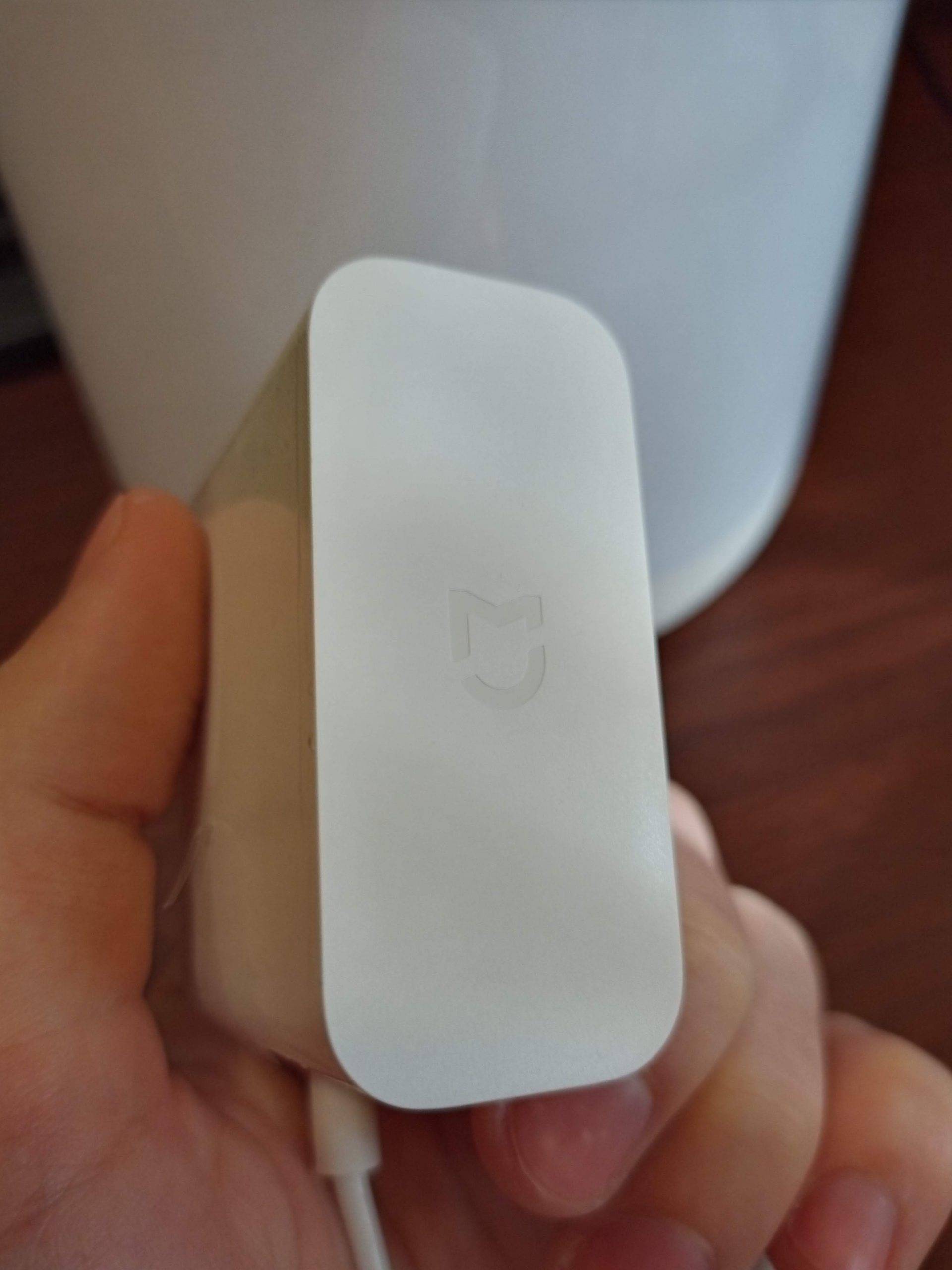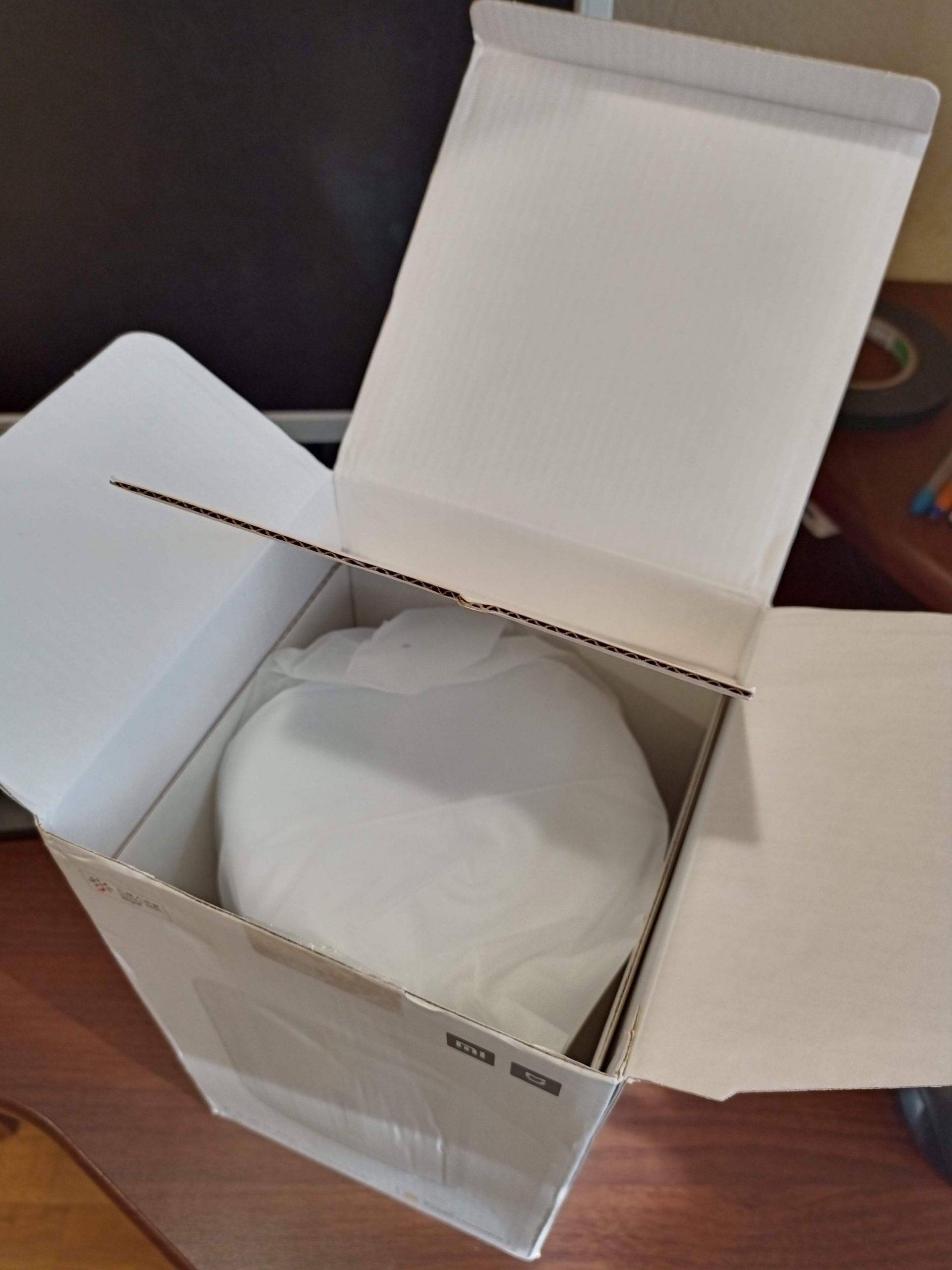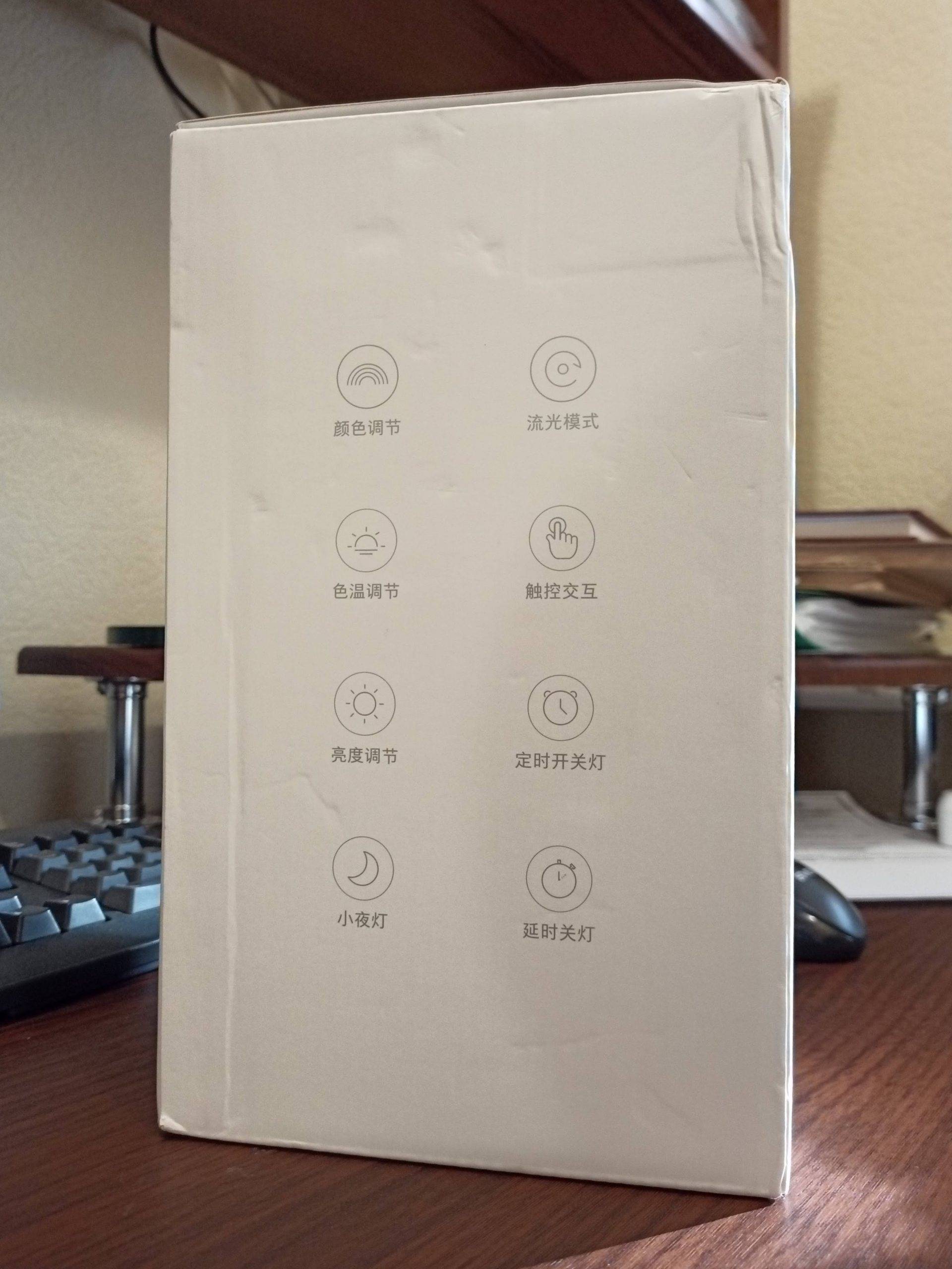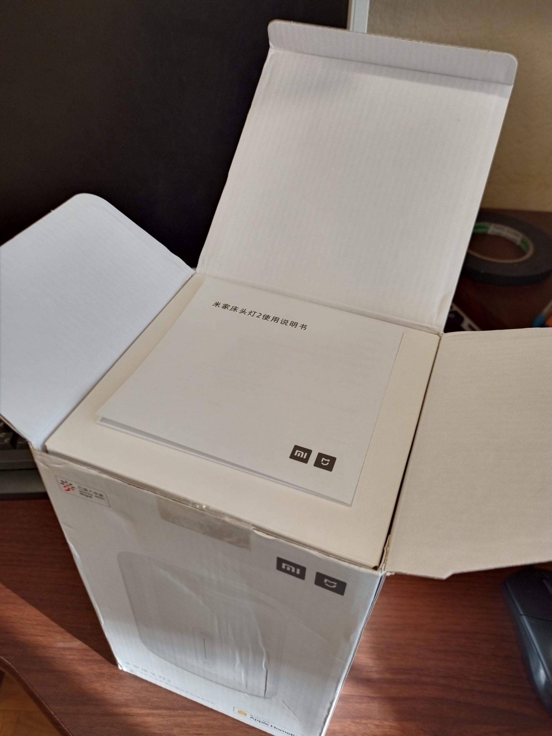 Отправили мне ее транспортной компанией, доставка около двух недель. Упаковка — белая коробка с изображением лампы и лого Xiaomi, Mijia и Apple HomeKit, который эта лампа поддерживает. Ну и куча разной инфы на китайском.