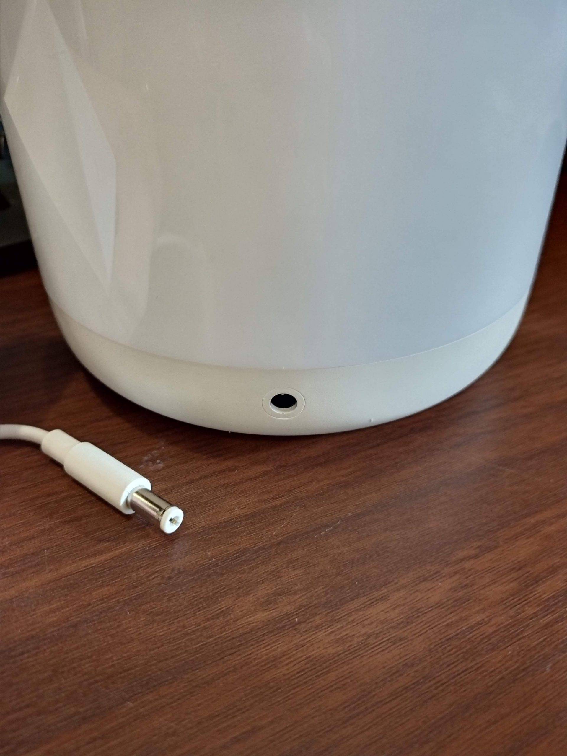 прикроватный светильник и “умная колонка”, рядом метеостанция и паровой увлажнитель воздуха