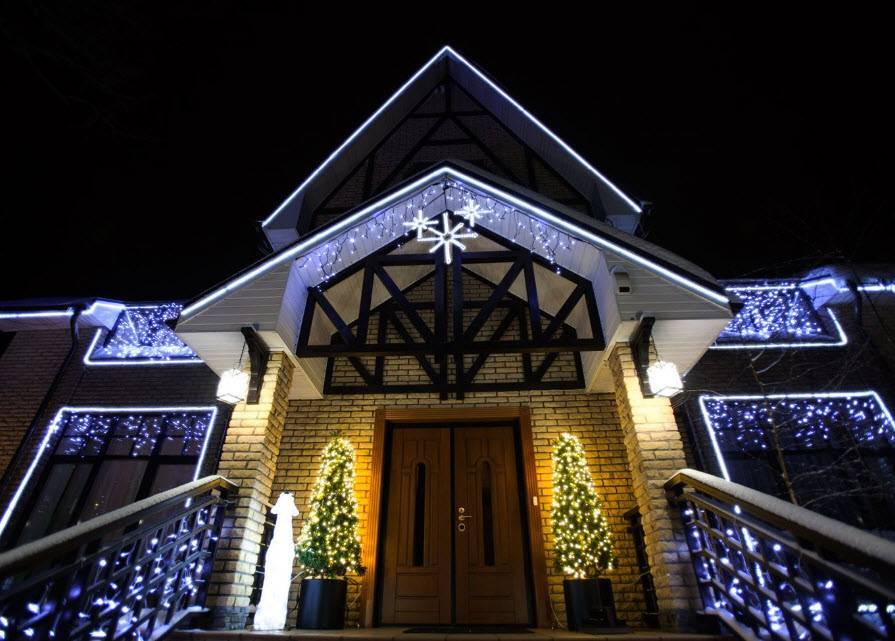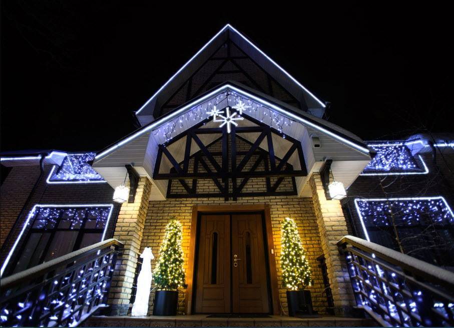 Оформление входа! Это могут быть электрические или тоже светодиодные гирлянды, обвивающие колонны, входную дверь, перила открытой террасы, ступеньки крыльца.