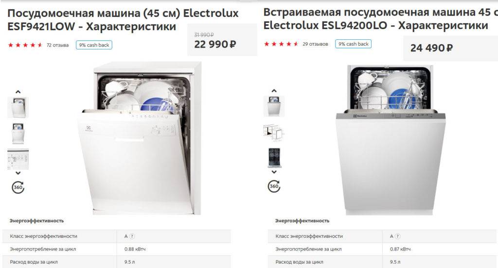 Посудомоечные машины действительно экономят воду, чтобы убедится в этом мы взяли информацию о характеристиках двух популярных моделей посудомоек на сайте M Видео.