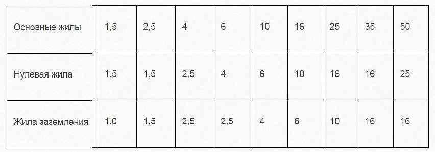 контуры освещения – 3х1,5; розеточные группы – 3х2,5; подключение мощной техники (бойлера, плиты, посудомойки) – 3х4.