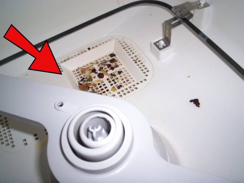 Нужно следить за тем, чтобы даже мельчайшие частички еды смывались водой, а не оставались в отделении для мытья. Крупные куски необходимо вытряхивать из специального отстойника.