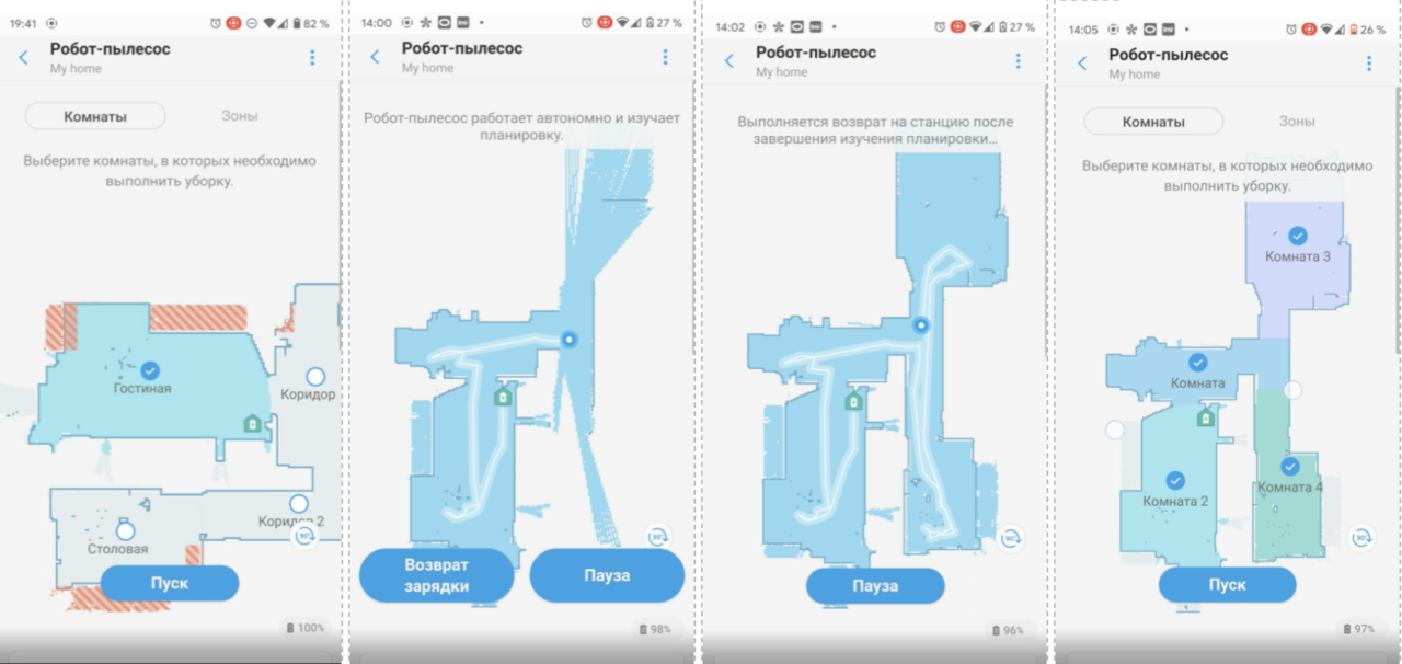 В отдельном окне можно посмотреть историю уборок с составленными картами; составлять расписание по дням недели с выбором нужной мощности, траектории движения и зоны уборки.