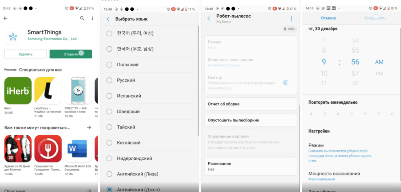Следует отметить, что SmartThings – это программа для организации «умного дома» Samsung, из-за чего в ней много самых разных функций, таких как управление телевизором, получение персональных рецептов и тому подобное. Особо распространяться о них не вижу смысла, лучше сразу перейдём на вкладку робота-пылесоса.