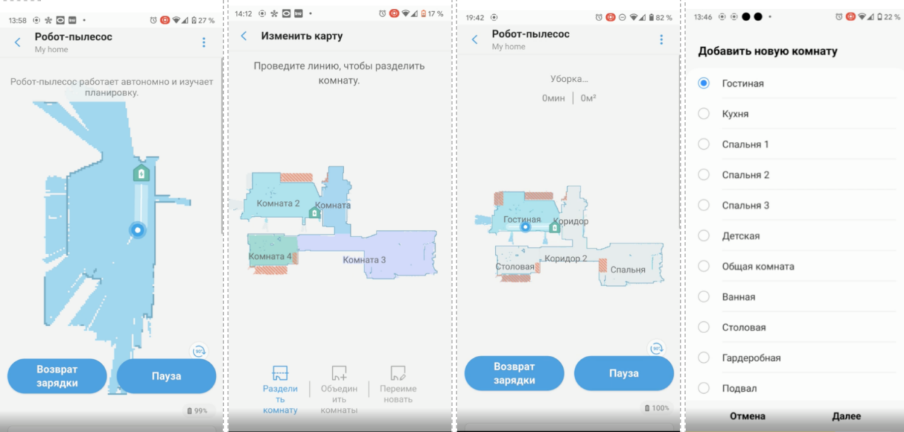 Я уже запускал автоматическую уборку, поэтому на главном экране отображается построенная карта с разбивкой на комнаты. Соответственно можно сразу выбрать, в каких локациях нужно навести порядок, либо обозначить на экране прямоугольные зоны. Для удобства карту можно поворачивать.