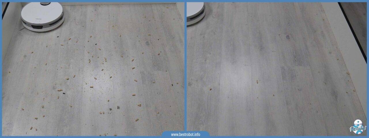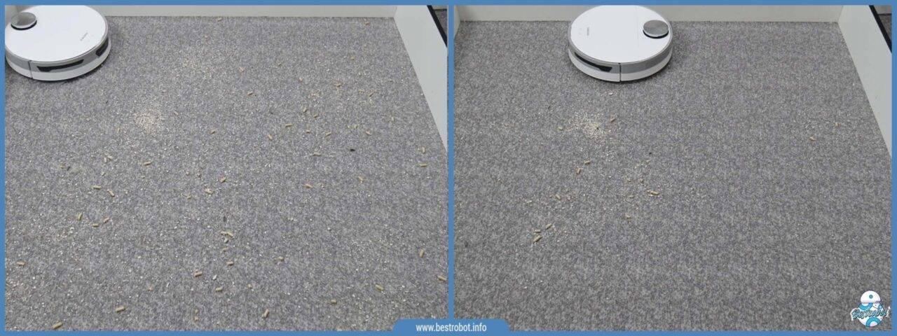 Начнём с мелкого мусора на ламинате. Большинству роботов этот тест не доставляет особых проблем, но только не Jet Bot+. Можете заметить, с каким трудом он прыгает по наполнителю и оставляет соринки по всему загону. Дело в том, что между валиком и раструбом остаётся очень маленький зазор, поэтому собирать крупный мусор роботу трудно. Вторая проблема – это слишком мягкая боковая щётка, которая оставляет вдоль стен буквально полосы крупы и крошек. Итоговый результат весьма посредственный – собрано только 80% мусора.
