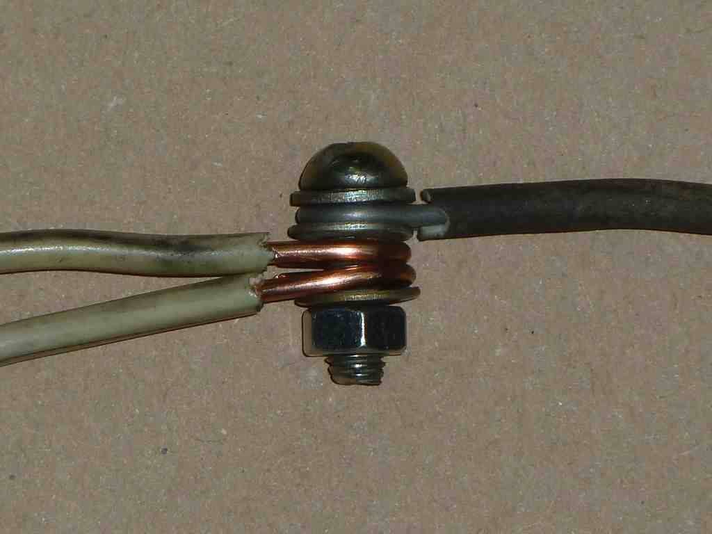 В моей практике были случаи, когда необходимо было соединить провода из разных материалов (меди и алюминия). Здесь просто не обойтись без болта с гайкой и шайбы, с помощью которых ток протекает по проводнику без всяких проблем. Тут главное хорошенько протянуть ключом болтовое соединение для лучшего контакта. Однако делать это надо без фанатизма, в противном случае можно загубить все дело на корню, сломав ключ или болт.