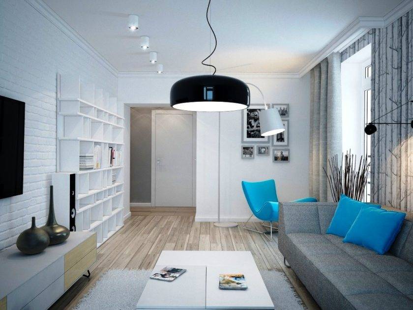 В противном случае, лучше использовать небольшие светильники встроенной системы, а для максимального освещения гостиной комнаты подбирают напольный светильник.