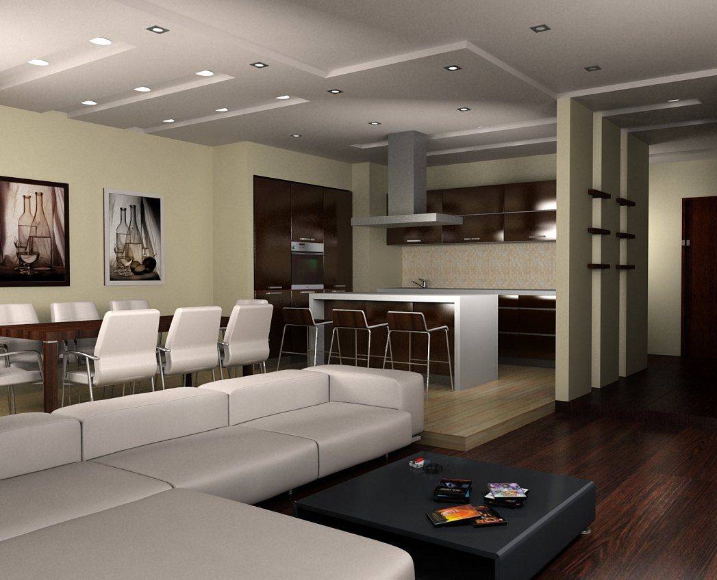 До того, как сделать косметический ремонт помещения, нужно представить, какое расположение подсветки будет наиболее удобным. Нужно также подсчитать их примерное количество, выделив наиболее “активные”, функциональные части кухни-гостиной.