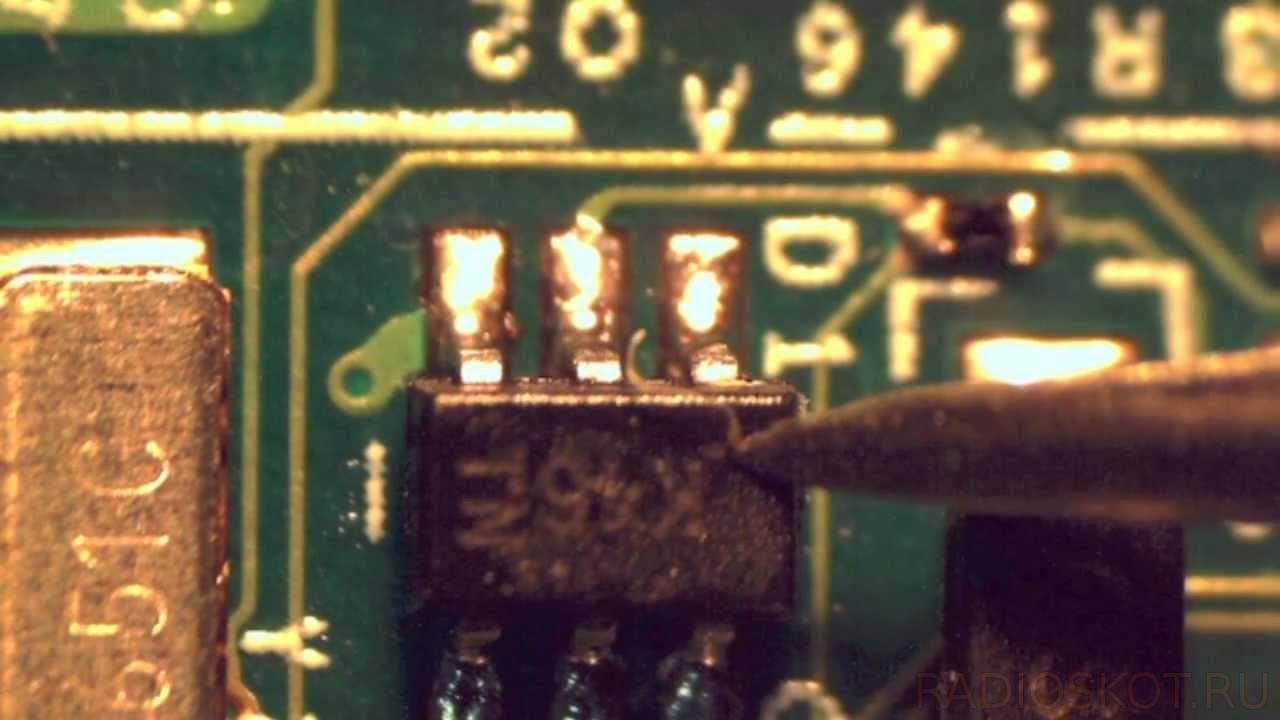 Контакты микросхемы у нас при этом замкнутся, но это не страшно, после того как демонтируем микросхему, мы легко с помощью демонтажной оплетки, уберем излишки припоя с контактов на плате, и с контактов на микросхеме.