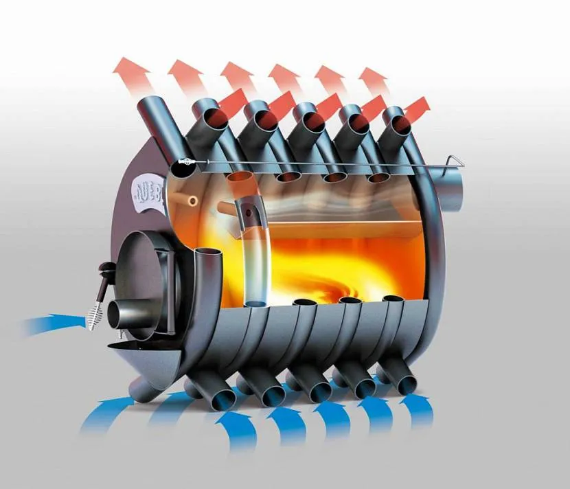 Подобные устройства комплектуются внутри керамическим либо стальным теплообменником, разогреваемым до нужной температуры с помощью открытого пламени. После этого данный элемент отдаёт тепло в окружающее пространство посредством естественной воздушной конвекции. Снизу через специальные отверстия в печь поступает холодный воздух, а сверху в окружающее пространство выбрасывается нагретый до высокой температуры.