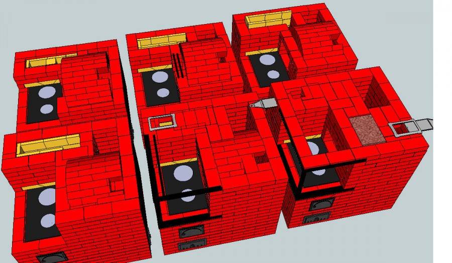 Конструкция разделяется на две части – топочный и газоотводящий отсеки. Внизу два канала, вверху – пять. Интересно, что верхние каналы на 2/3 перекрываются кирпичами так, чтобы образовалось «сито». Это «сито» не дает напрямую выходить теплу в трубу.