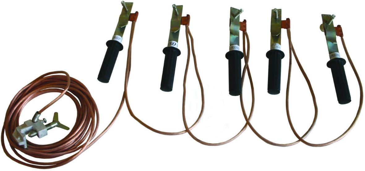 Относительно заземлений переносных для воздушных линий (ВЛ) нужно отметить следующее. Они состоят из специальных заземлителей и так называемых «спусков», соединяющих их с элементами временно обустраиваемого защитного контура. Функцию таких спусков для ж/б опор ЛЭП с рабочими напряжениями 6-10 кВ выполняют элементы напряженной арматуры стоек, которые напрямую соединены с заземлителем. В ситуациях, когда опоры закреплены фиксирующими оттяжками – их также допускается использовать в качестве заземляющих проводников (в дополнение к уже имеющимся отводам).
