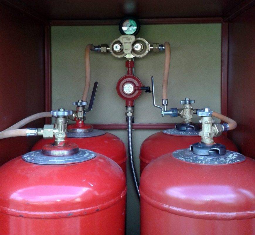 Одновременно используются несколько наиболее вместительных 50-литровых баллонов, объединенных в единую батарею. Баллоны размещаются в металлических, вентилируемых шкафах на улице с северной стороны дома, во избежание нагрева солнечным излучением. Другой вариант – отдельно стоящее нежилое помещение.
