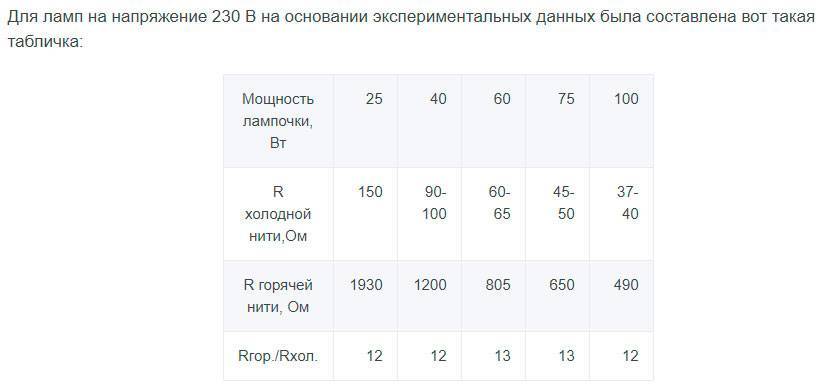 Вот сравнительная табличка сопротивлений лампочек разной мощности от 25Вт до 100Вт.
