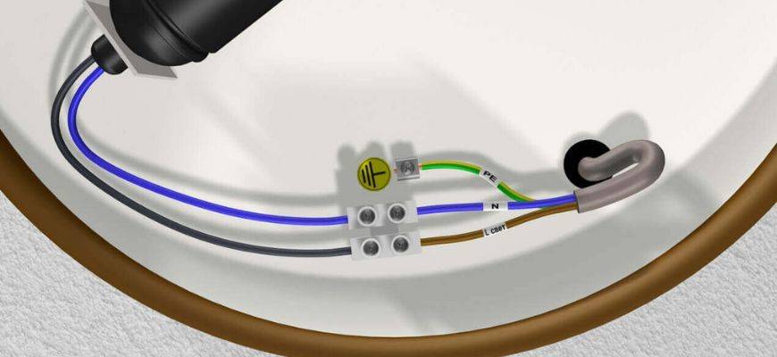 Для начала нужно разобраться с проводами, которые выходят из потолка. Их может быть два, три или четыре. Если проводов больше двух, то один из них может быть заземлением. Отличить его достаточно просто: у него желто-зеленый цвет изоляции. Это требование одинаково во всех странах, поэтому ошибка исключена.