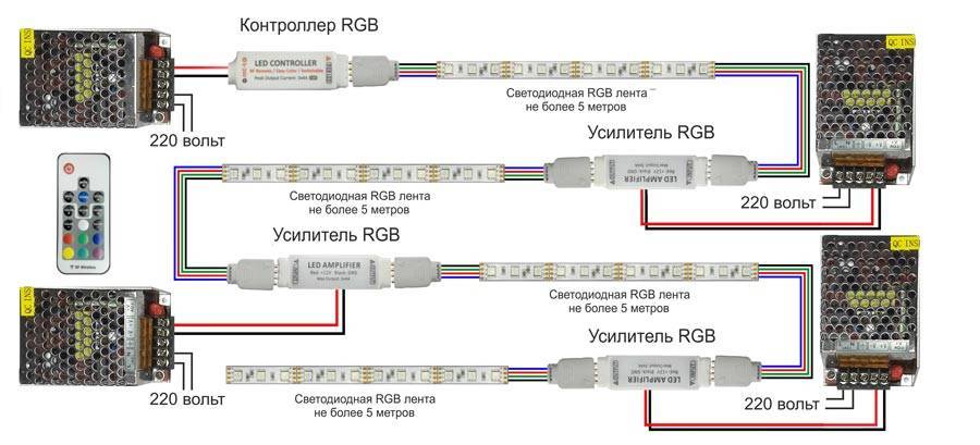 Когда разобрались с подключением контроллера к RGB-ленте, ваш следующий шаг – соединить все оставшиеся детали в общую цепь. Рассмотрим несколько схем подключения, когда требуется соединить один и более отрезок, а также в каком случае необходим усилитель.