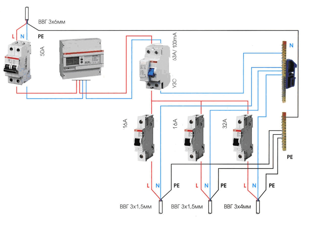 Имейте в виду, что широкое распространение получила ещё одна разновидность такой схемы, в ней между вводным автоматом и УЗО принято устанавливать счётчик электрической энергии.