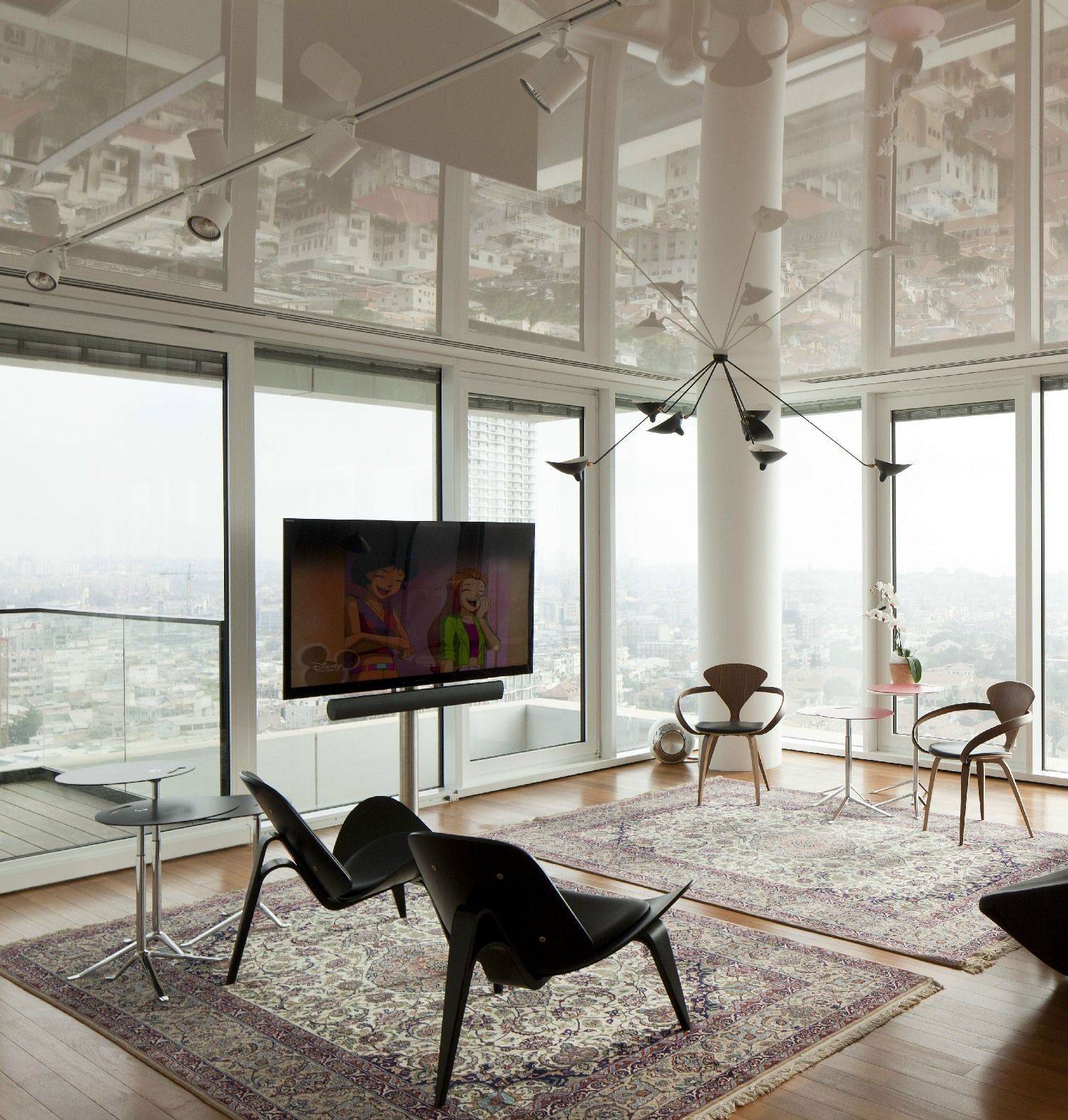 На фото настенные споты, расположенные над тв-зоной в интерьере гостиной.