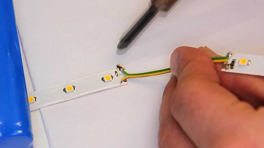 Процесс монтажа упрощается, если приобретен кусок ленты с уже подсоединенными проводами.